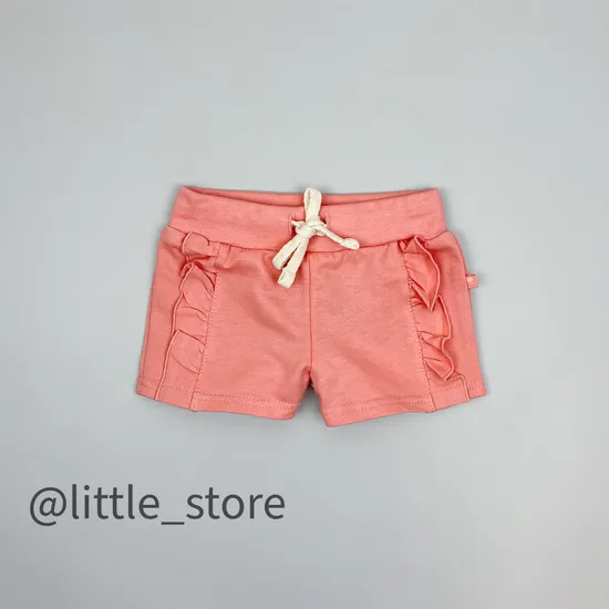 Шорты выполнены из однотонного футера 2нитки, мягкого и качественного. Пояс регулируется шнурком, шорты украшены интересными оборками спереди, низ обработан плоскими швами.