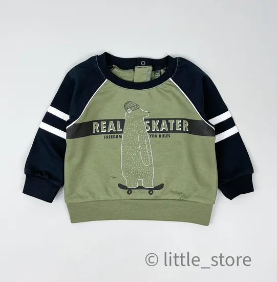 Свитшот из футера "Мишка и скейтборд" темно-оливковый